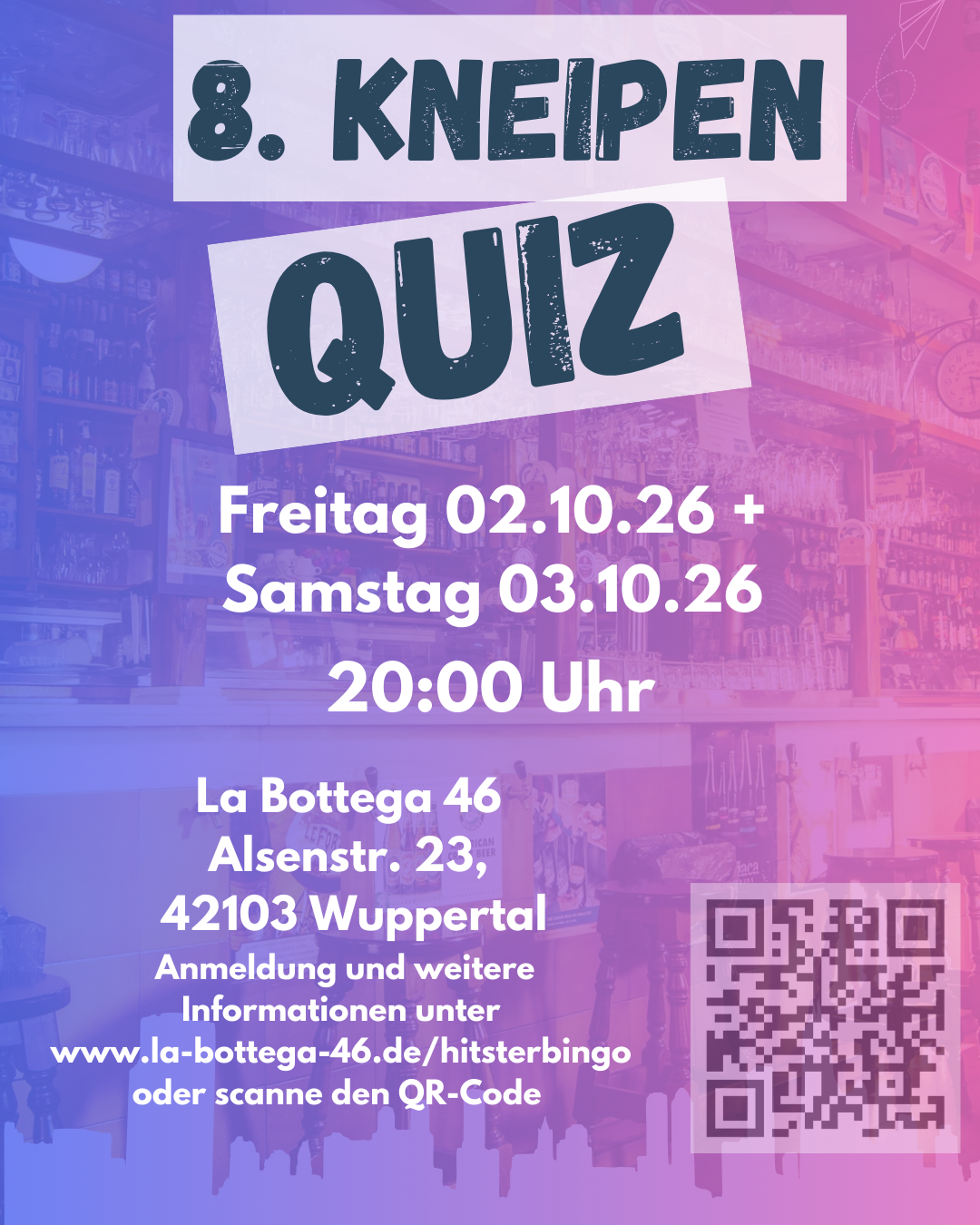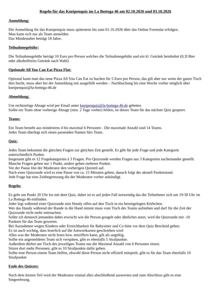 3. Wird es eine optionale Zubuchoption geben. Beim Quiz wird es für jedes Team die Möglichkeit geben eine All You Can Eat Pizza-Flat für 5 Euro pro Person zu buchen. Dies gilt jedoch für das gesamte angemeldete Team! Somit ist es nicht möglich die als Einzelperson zu buchen. Die Option kann bis 26.09.2026 per Email an kneipenquiz@la-bottega-46.de nach gebucht werden.
