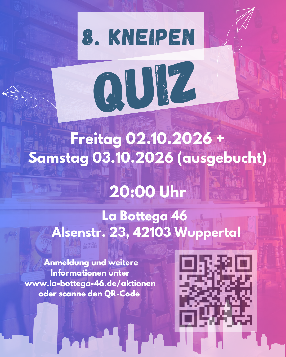 3. Wird es eine optionale Zubuchoption geben. Beim Quiz wird es für jedes Team die Möglichkeit geben eine All You Can Eat Pizza-Flat für 5 Euro pro Person zu buchen. Dies gilt jedoch für das gesamte angemeldete Team! Somit ist es nicht möglich die als Einzelperson zu buchen. Die Option kann bis 26.09.2026 per Email an kneipenquiz@la-bottega-46.de nach gebucht werden.